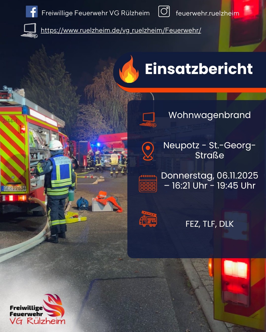 Gestern Mittag wurden wir nach Neupotz zu einem Wohnwagenbrand alarmiert. Schon auf der Anfahrt war die Lage deutlich zu erkennen. Beim Eintreffen an der Einsatzstelle bestätigte sich die Lage. Der Wohnmobilbrand hatte bereits auf einen Balkon und ein Wohnhaus übergegriffen. Der Einsatz wurde in mehrere Abschnitte unterteilt. Unsere Drehleiter wurde umgehend in Stellung gebracht und mit Wasserwerfer und einem D-Rohr wurden Glutnester abgelöscht. Im weiteren Verlauf wurde die Dachhaut geöffnet und Ziegeln entfernt.