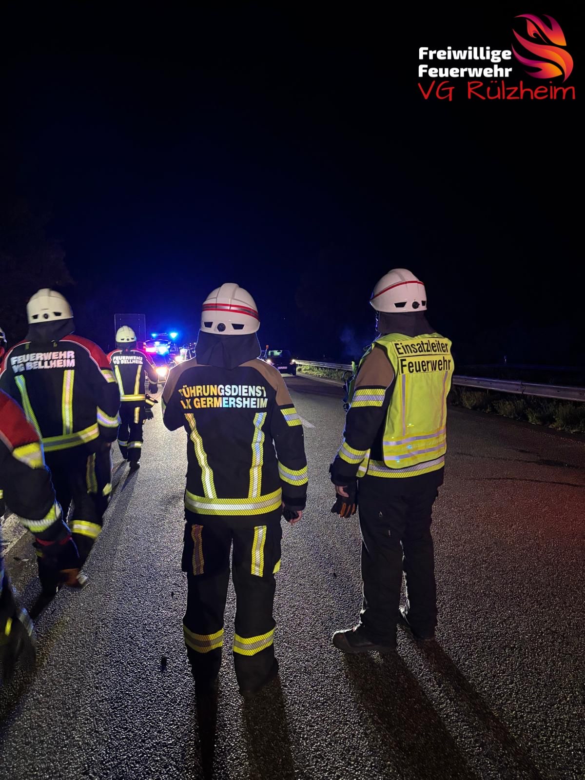 Außerdem vor Ort waren der stellvertretende Brand- und Katastrophenschutzinspekteur, der leitende Notarzt, der organisatorische Leiter, verschiedene Rettungsmittel des DRK und der Malteser, der Landesbetrieb Mobilität, die Polizei Germersheim mit mehreren Streifen und die Kamerad*innen der Freiwilligen Feuerwehr Bellheim.