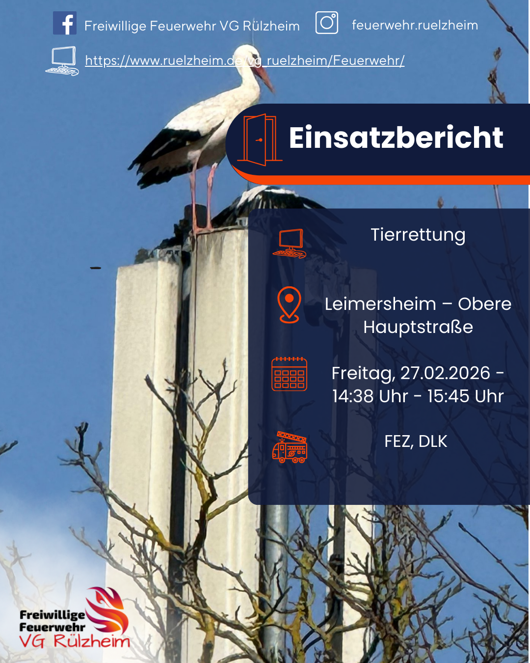 Gestern Mittag wurden wir zu einem Tier in Notlage alarmiert. Ein Storch hatte sich in der Antenne eines Mobilfunkmastes verfangen. Das Tier konnte sich aus seiner Notlage selbst befreien und ist davongeflogen. Somit war kein Eingreifen durch uns notwendig.