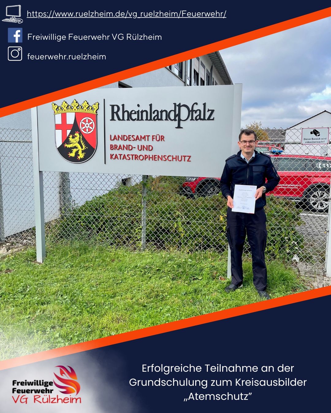 Lucas Leibach nahm vom 22. bis 26. September an der Grundschulung zum Kreisausbilder „Atemschutz“ am LfBK teil. Die Ausbildung basierte auf der Feuerwehrverordnung, FwDV 2 und 7 sowie dem Konzept für die Kreisausbildung Rheinland-Pfalz. Ziel des fünftägigen Lehrgangs war die Vermittlung theoretischer und praktischer Grundlagen für die Tätigkeit als Kreisausbilder im Bereich Atemschutz.