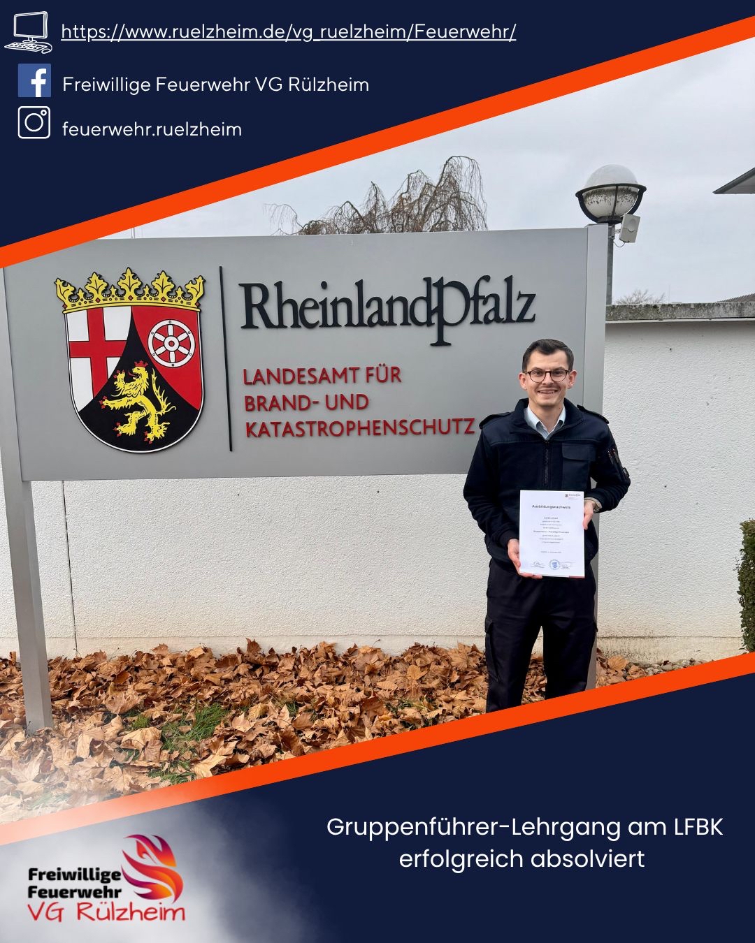 Lucas Leibach (Einheit Rülzheim) absolvierte vom 13.10. bis 17.10. und 10.11. bis 14.11. die Ausbildung zum Gruppenführer am Landesamt für Brand und Katastrophenschutz Rheinland-Pfalz. Der Lehrgang befähigt dazu, eine Gruppe zu führen sowie Einsätze mit Einheiten bis zur Gruppengröße eigenständig zu leiten. Dabei wurden umfassende Kenntnisse in Bereichen wie Rechtsgrundlagen, Brennen und Löschen, Baukunde, Einsatztaktik sowie das Führen einer Gruppe vermittelt. Diese Woche folgte dann die theoretische und praktischen Abschlussprüfung, welche Lucas mit Erfolg gemeistert hat.
