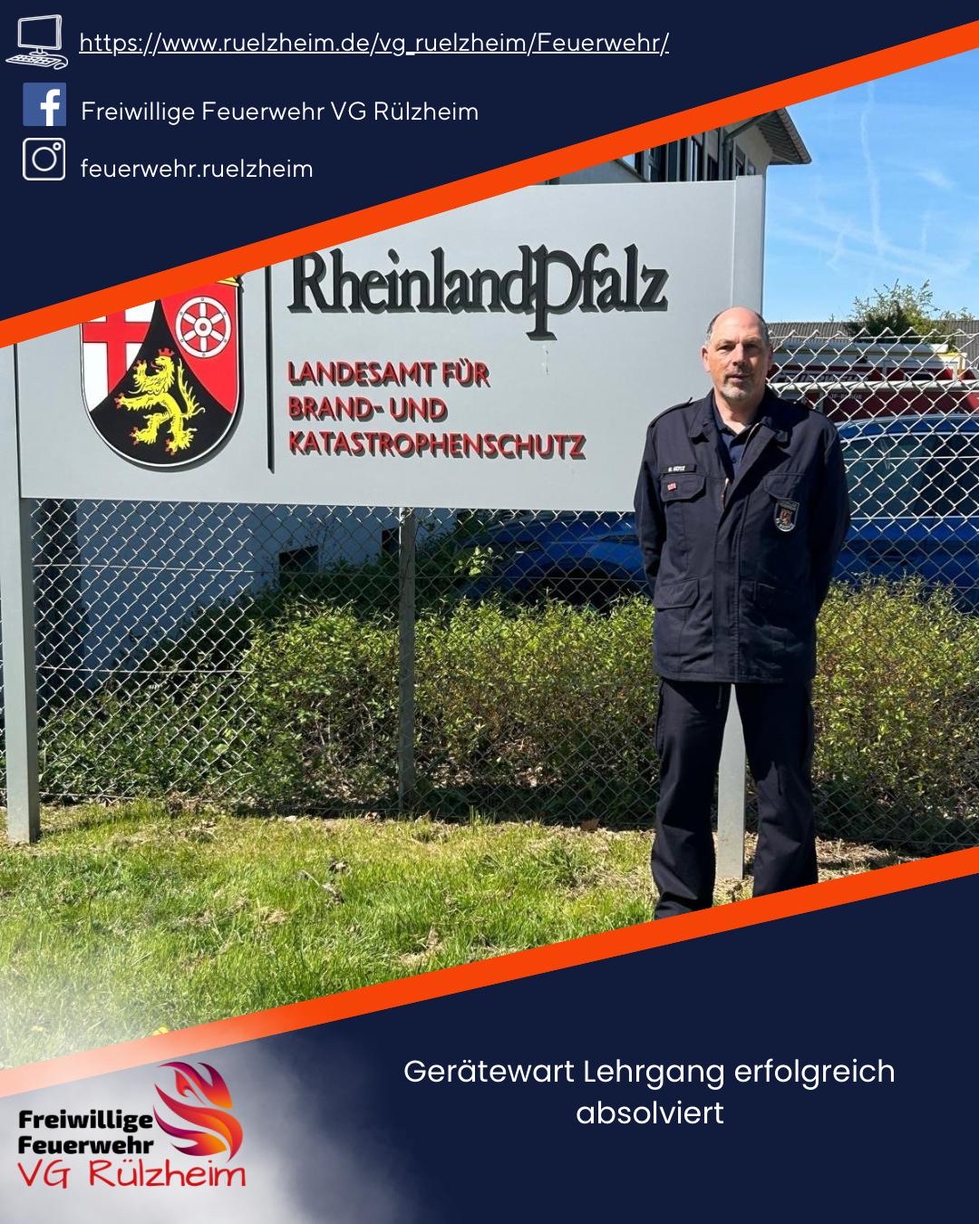 Gregor Götz (Einheit Kuhardt) hat in dieser Woche am Gerätewart Lehrgang am LFBK teilgenommen und diesen erfolgreich bestanden. Ziel des Lehrgangs ist die Befähigung zur Wartung, Instandhaltung, Pflege und Prüfung der Beladung von Feuerwehrfahrzeugen und der persönlichen Ausrüstung.