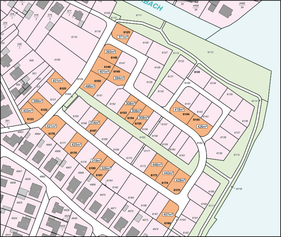 Der Bebauungsplan für die momentan noch gemeindeeigenen Flächen ab ca. 500 m² bis ca. 600 m² sieht Grundstücke für die Einzel- bzw. Doppelhausbebauung vor.