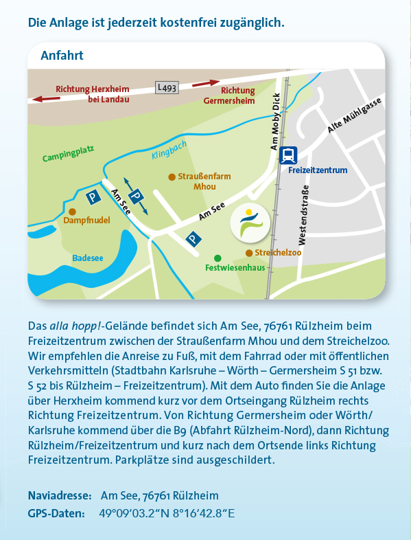 Wir empfehlen die Anreise zu Fuß, mit dem Fahrrad oder mit öffentlichen Verkehrsmitteln (Stadtbahn Karlsruhe – Wörth – Germersheim S 51 bzw. S 52 bis Rülzheim Freizeitzentrum). Die Stadtbahn hält direkt neben der alla hopp!-Anlage.