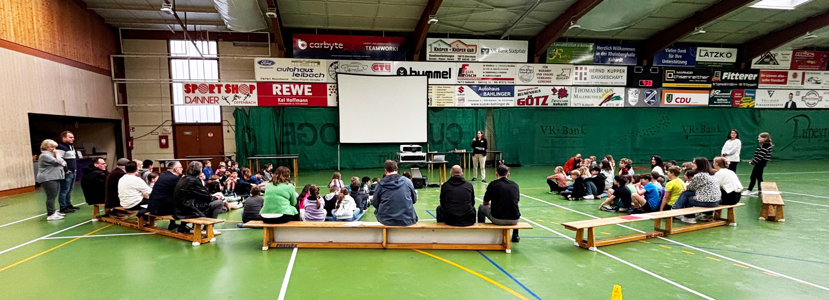 Seitens der Verbandsgemeinde kümmerten sich die Beigeordnete für Jugend und Ehrenamt, Kathrin Hamburger, und Carolin Leingang, bei der Verwaltung für dieses Thema verantwortlich, federführend um das Projekt. Sie organisierten auch die Abschlussveranstaltung in der Rheinberghalle. Dort bekamen die Kinder der vier Grundschulen das Ergebnis ihres Engagements erstmals zu sehen.